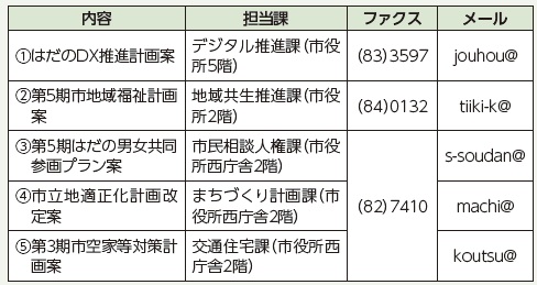 提出方法:任意の用紙に住所、氏名、電話番号、意見を書き、11月19日~12月18日(木)に〒257-8501各担当課へ郵送または持参。ファクス、メール、電子申請も可