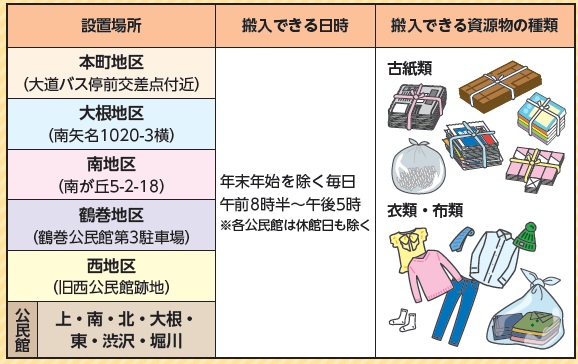 環境資源センター(名古木409)では、上記の資源物のほか、プラスチック、ペットボトル、カン、ビン、蛍光灯、乾電池、使用済ライター、スプレー缶の搬入ができます。