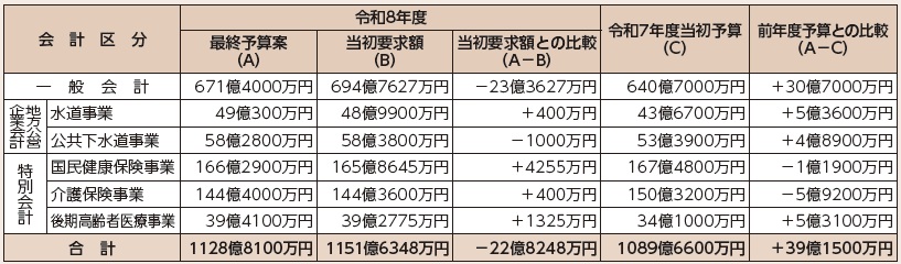 令和8年度の一般会計予算案は、671億4000万円で、前年度と比べて30億7000万円増えています。二つの地方公営企業会計、三つの特別会計の予算案は右表のとおりです。これらの予算案は、2月26日に開議した市議会第1回定例月会議で審議されています。詳しくは、広報はだの4月1日号でお知らせします。